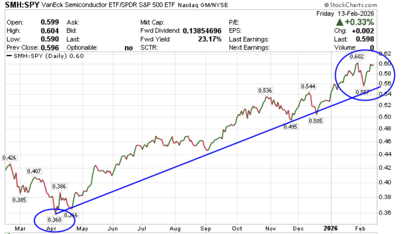 In our favorite relative strength chart for market direction, below we see that the semis continue to lead the market higher, just as they’ve done from exactly the 4/7/25 market lows.