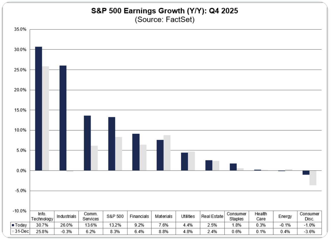 9 of 11 S&P 500 sectors are reporting Y/Y earnings growth for Q4, led by the Information Technology and Industrials sectors with EPS growth of 30.7% and 26%. At the same time, on both revenue and earnings, we’re seeing beats to analyst estimates of more than 73%.