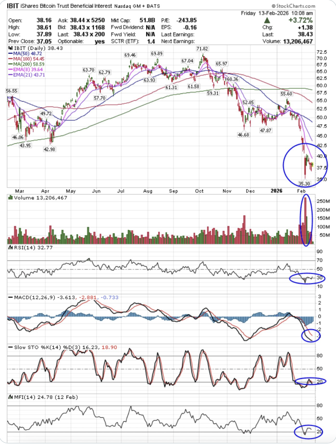 Our call: the lows are in for Bitcoin. Below we see that $IBIT (Blackrock Bitcoin ETF) had a clear selling climax 7 days ago with a record level of volume just as BTC hit its 3rd most oversold levels in history (on RSI) and as the Fear & Greed index for BTC hit its most oversold levels in history (with a reading of just “5"). In addition, IBIT hit "extreme oversold on steroids", our most oversold levels on the VRA System. The rubber band stretched too far. Capitulation. Bottom line; the lows are in. We're buyers.