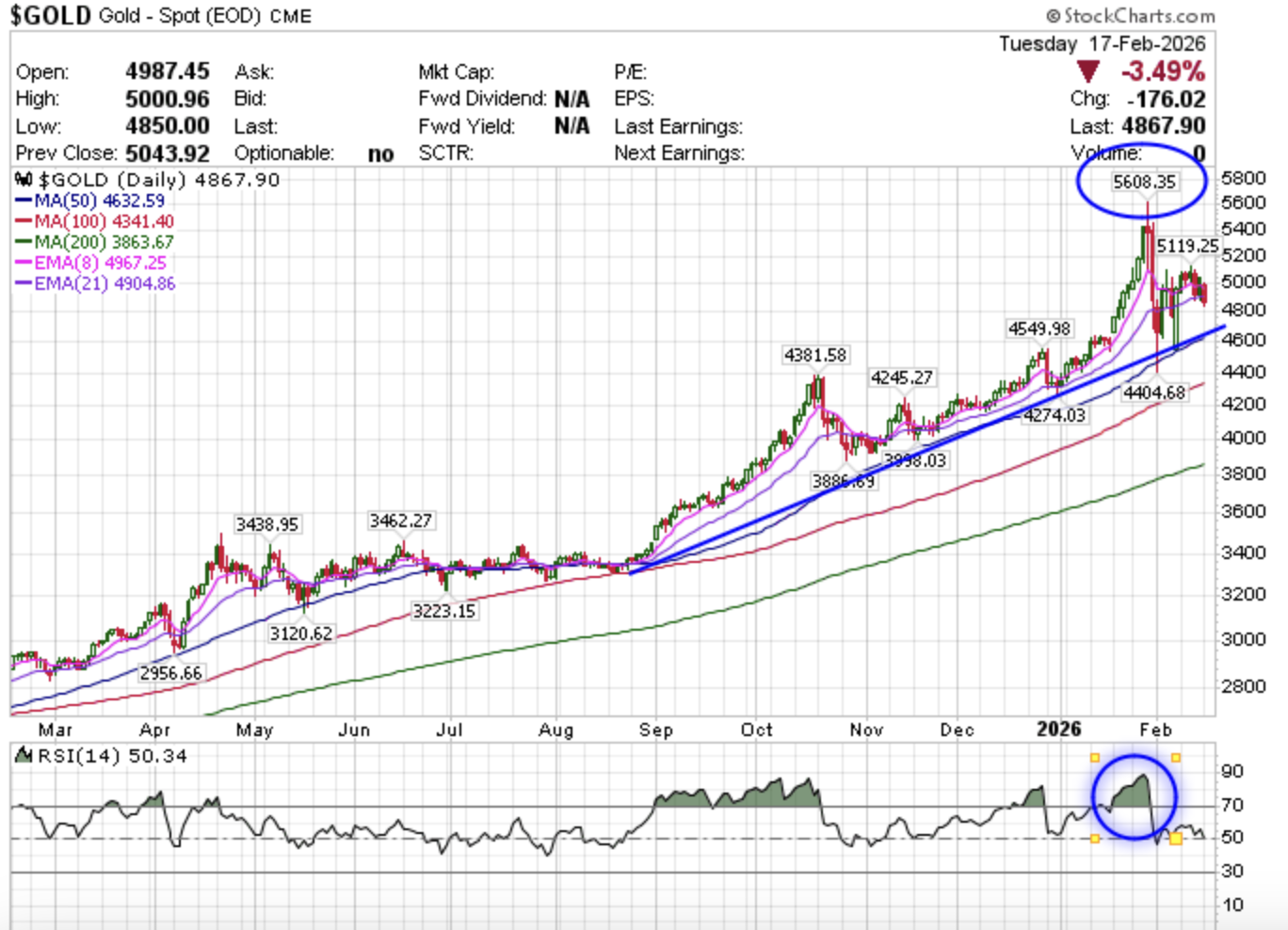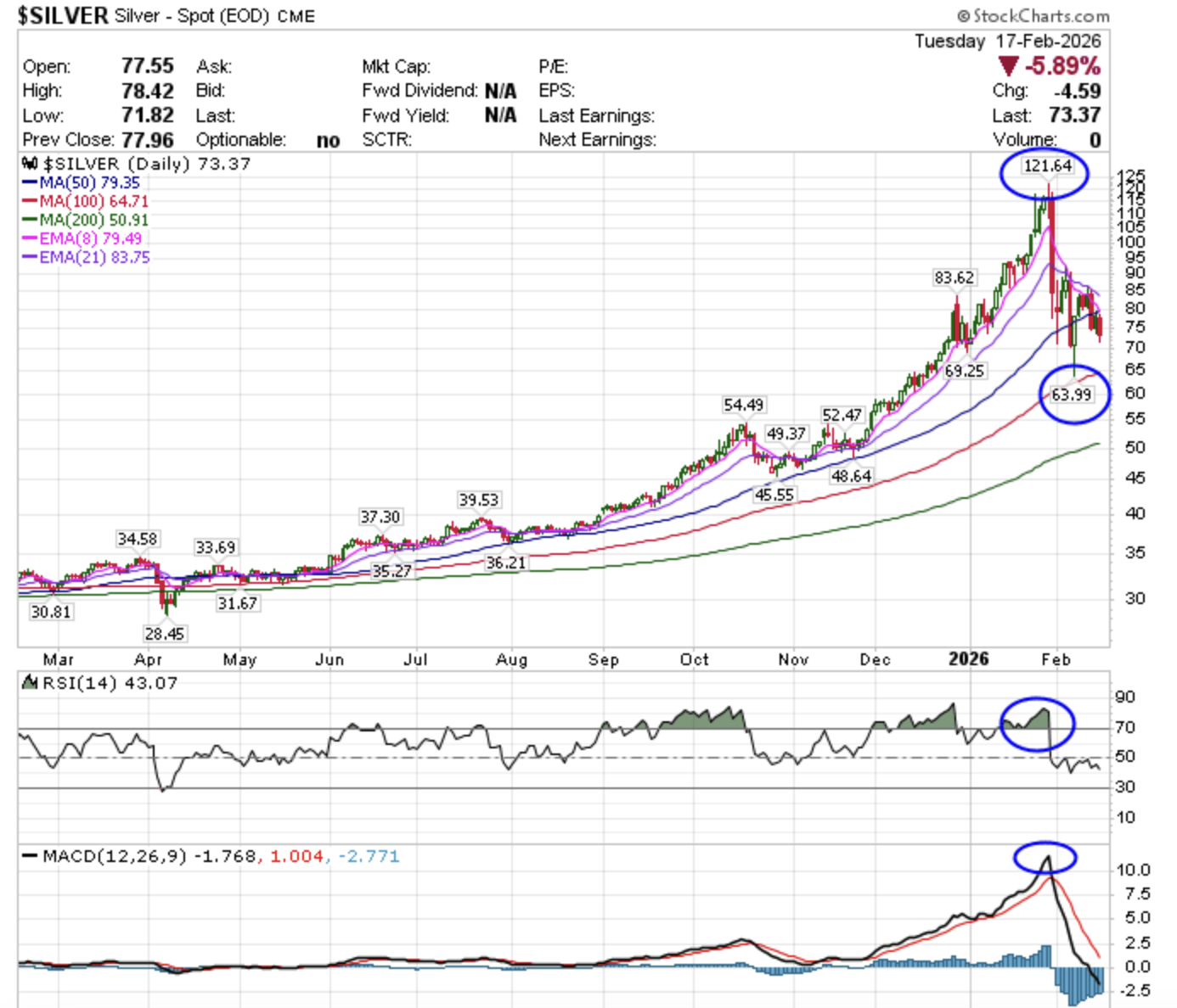 The big drivers? A stronger US dollar, super thin trading volumes (since Asian markets were closed for Lunar New Year), plus investors easing off safe-haven bets with no fresh geopolitical drama. It was more technical noise than fundamentals. Precious metals have been ripping higher all year and as seen below, an extreme overbought pullback was due. These dips are a buying opportunity.